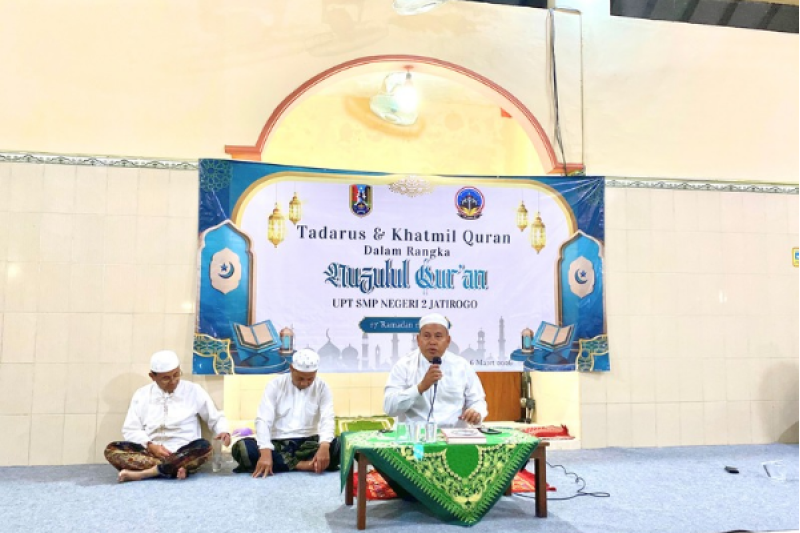 Suasana khidmat dan penuh kekeluargaan menyelimuti Musholla Darut Taqwa UPT SMP Negeri 2 Jatirogo pada Jumat malam, 6 Maret 2026. Seluruh warga sekolah berkumpul untuk memperingati malam Nuzulul Quran 17 Ramadan 1447 H melalui rangkaian kegiatan religius yang berlangsung dengan tertib dan penuh makna. Kegiatan ini menjadi bagian dari program pembinaan keagamaan yang secara rutin diselenggarakan sekolah selama bulan suci Ramadan.