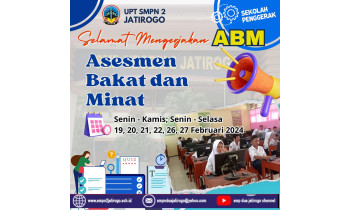 Senin, 19 Februari 2024, 220 peserta didik kelas IX UPT SMP Negeri 2 Jatirogo mengikuti Asesmen Bakat Minat (ABM) tahun 2024 secara online atau CBT. Pelaksanaan ABM yang dilaksanakan di 2 ruang laboratorium komputer ini, akan berlangsung selama 6 hari (19, 20, 21, 22, 26,...