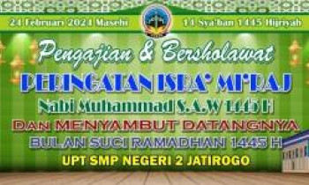 Dok. : Flayer pengumuman.Dok. : Foto keluarga besar SMPN 2 Jatirogo bersama KH. Agus Salim.Peringatan Isra’ Mi’raj Nabi Muhammad S.A.W merupakan kegiatan rutinitas tahunan SMP Negeri 2 Jatirogo. Kegiatan yang berlangsung di halaman tengah atau lapangan upacara ini diadakan kemarin Sabtu, (24 Februari 2024 Masehi...